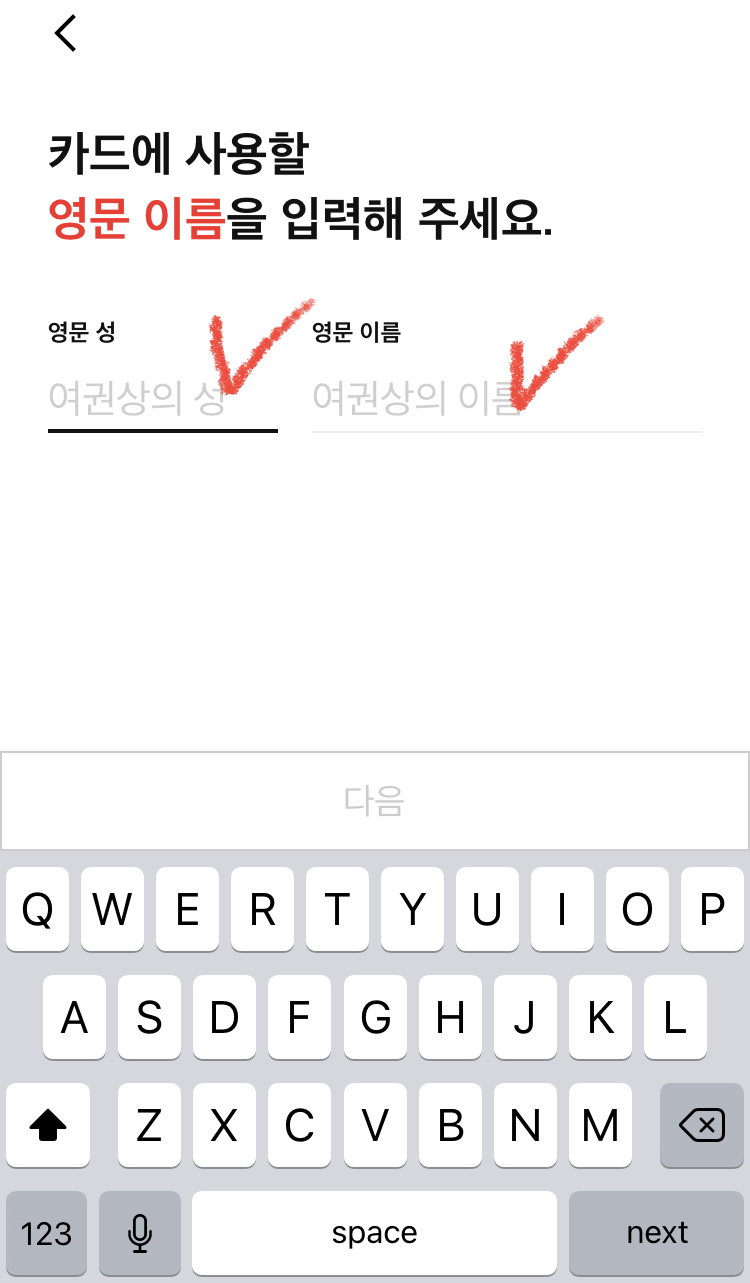 영문 성과 영문 이름 (국내전용의 경우 입력하지 않습니다) 등등 입력 후