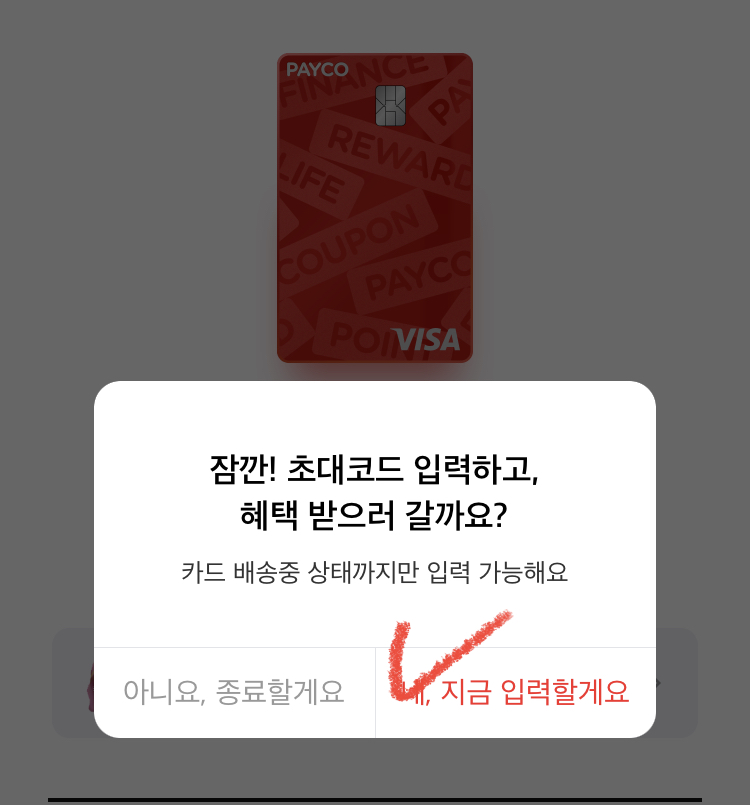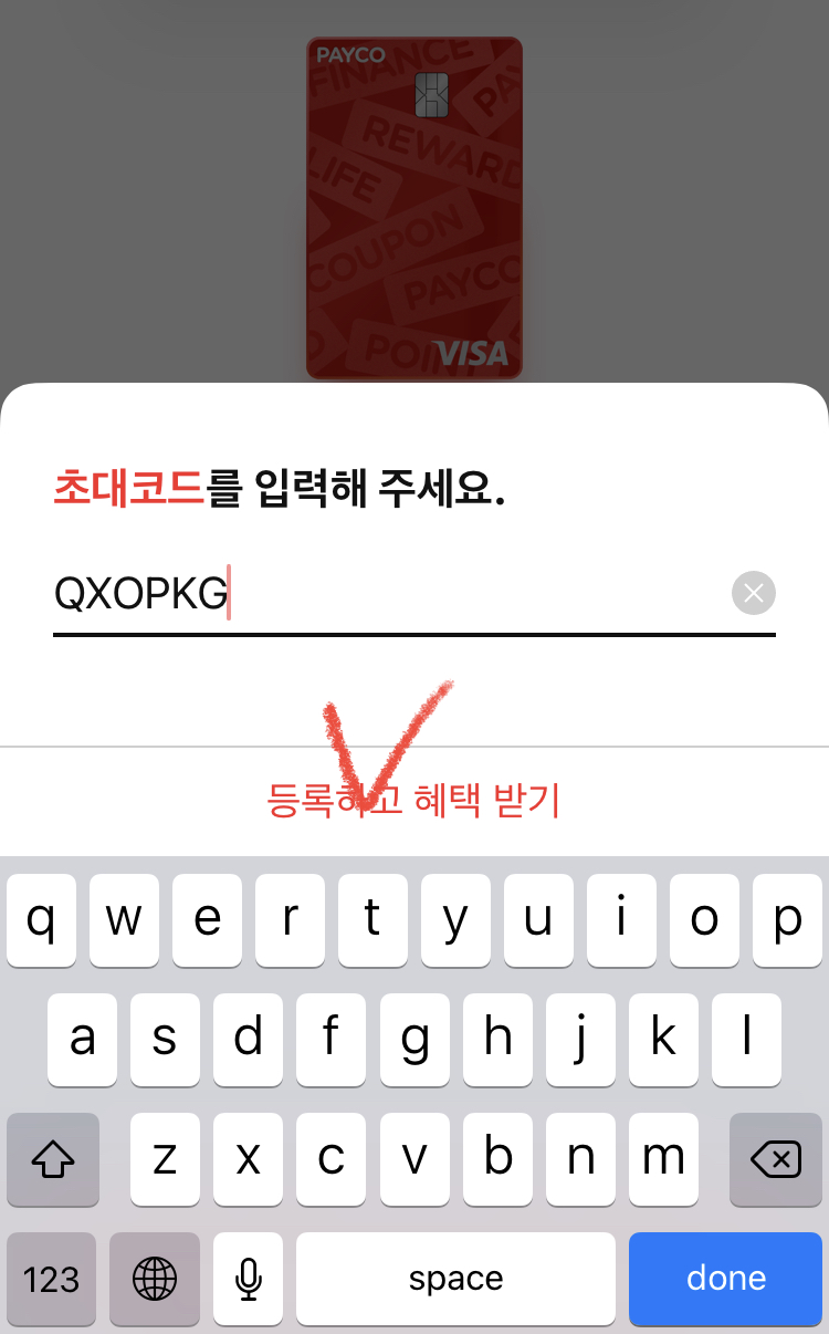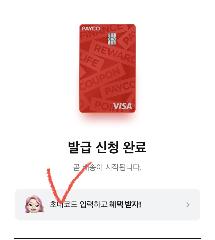 발급 신청 완료가 나오면, 초대코드 입력하고 혜택받기 클릭!
