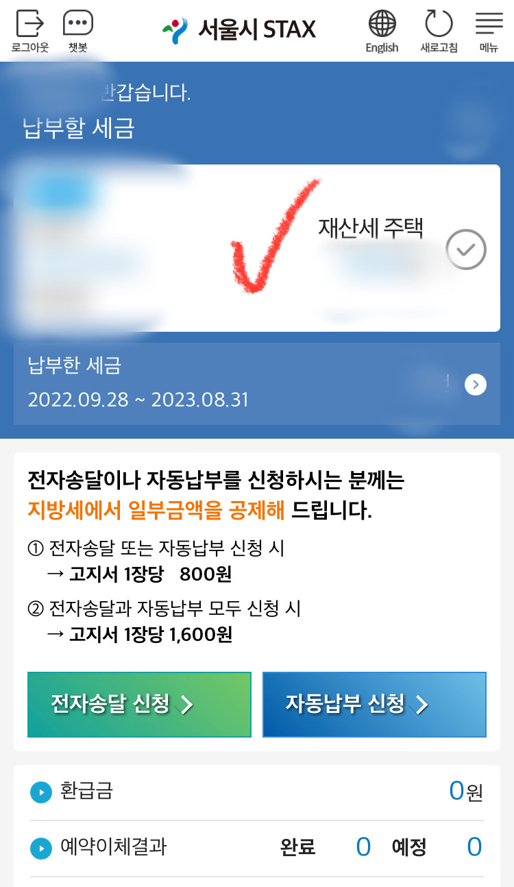 서울시 STAX 어플에 들어가면, 납부해야 할 세금이 뜬다